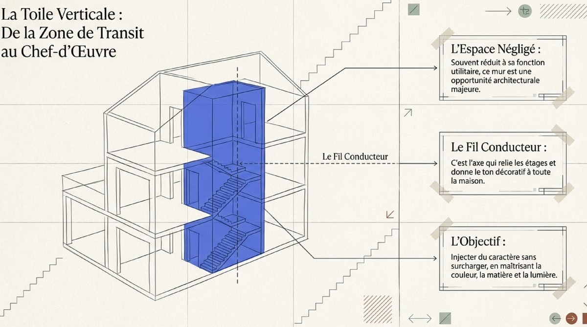Oubliée, la cage d’escalier triste et impersonnelle ! Cet espace de transition, souvent négligé, est une véritable toile blanche qui ne demande qu’à être sublimée. Loin d’être un simple lieu de passage, le mur de l’escalier est une opportunité en or pour injecter du caractère, de la personnalité et une dose de « wow » dans votre intérieur. C’est le fil conducteur qui relie les étages, et sa décoration donne le ton à toute la maison.