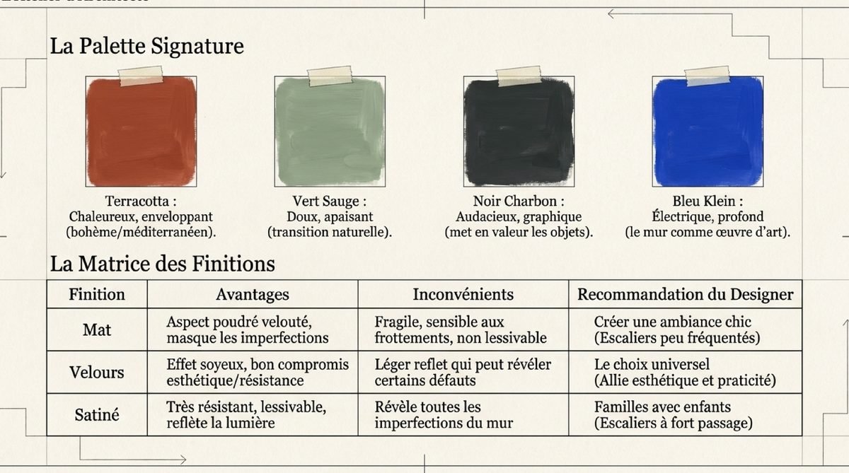 | Mat | Aspect poudré et élégant, masque les petites imperfections du mur. | Fragile, sensible aux taches et aux frottements, non lessivable. | Créer une ambiance feutrée et chic, pour les escaliers peu fréquentés. |