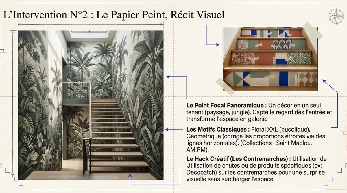Si la peinture donne le ton, le papier peint, lui, raconte une histoire. C’est la solution parfaite pour ceux qui veulent insuffler une dose massive de personnalité et d’originalité dans leur montée d’escalier. Les possibilités sont infinies, des motifs les plus discrets aux fresques panoramiques les plus exubérantes. Un papier peint à motif floral de grande taille, par exemple, peut transformer un escalier banal en une promenade bucolique et romantique. Les marques comme Saint Maclou ou AM.PM proposent des collections magnifiques, avec des designs allant du vintage au contemporain. Pour un look plus moderne et graphique, les motifs géométriques ou abstraits sont un excellent choix. Ils créent un dynamisme visuel qui accompagne le mouvement de la montée et peuvent même aider à corriger visuellement les proportions d’une cage d’escalier étroite en utilisant des lignes horizontales.