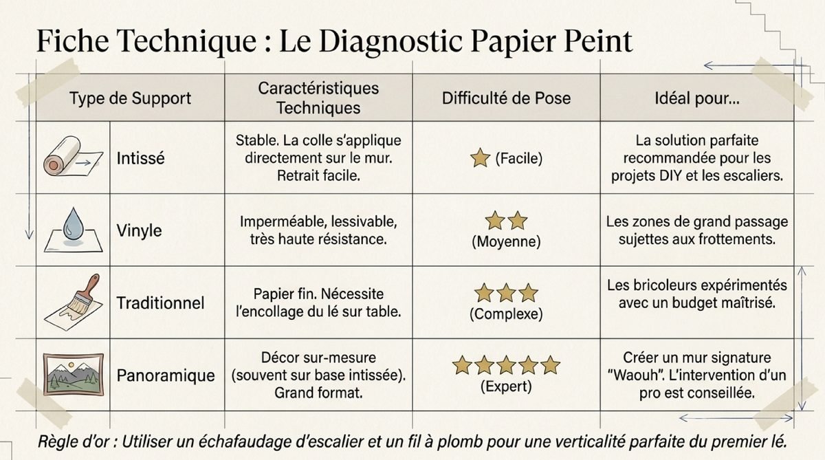 Le tableau suivant récapitule les types de papier peint et leur usage recommandé pour un escalier.