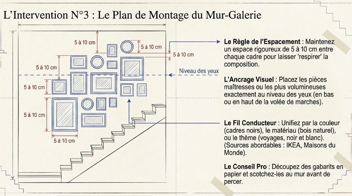 La réussite d’un mur de cadres tient à l’équilibre visuel. Espacez les cadres de manière relativement égale (environ 5 à 10 cm entre chaque) pour que l’ensemble respire. Essayez de placer les pièces les plus grandes ou les plus impactantes visuellement au niveau des yeux, que ce soit en bas ou en haut de l’escalier, pour créer des points d’ancrage. L’éclairage est également fondamental pour mettre en valeur votre galerie. Des appliques murales directionnelles ou des spots sur rail peuvent être orientés pour illuminer spécifiquement certains cadres, créant ainsi un effet digne d’une véritable exposition d’art. Un bon éclairage non seulement sublime vos œuvres, mais il assure aussi la sécurité dans l’escalier. Pour des conseils plus généraux sur l’éclairage, consultez notre article sur comment bien utiliser l’éclairage en décoration. C’est un investissement qui change tout !