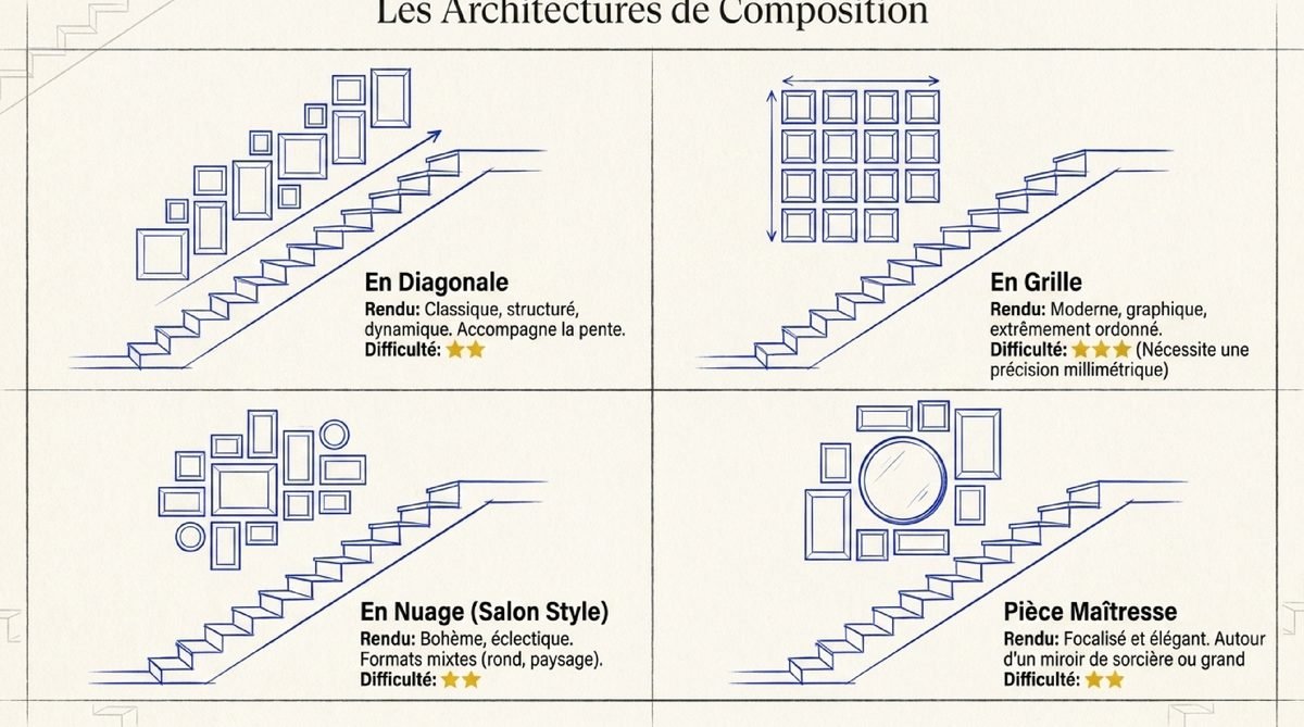 | En Diagonale | Les cadres suivent la pente de l’escalier, créant une ligne ascendante claire. | ⭐⭐ | Classique, structuré et dynamique. |