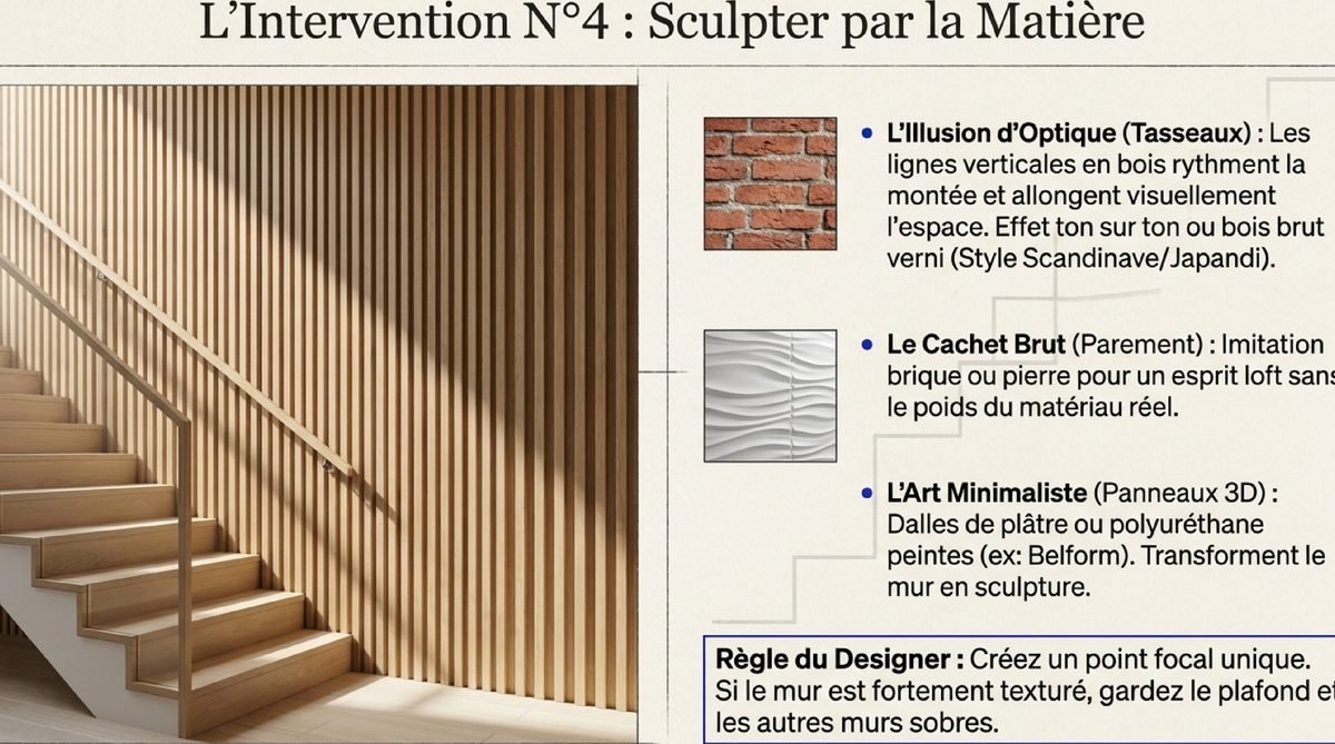 Au-delà de la couleur et des motifs, la texture est une dimension sensorielle puissante en décoration. Introduire du relief sur les murs d’un escalier est une façon incroyablement sophistiquée de lui donner du corps et de la chaleur. La tendance phare dans ce domaine est sans aucun doute l’utilisation de tasseaux de bois. Ces lattes de bois, posées verticalement à intervalles réguliers, créent un jeu d’ombres et de lumières fascinant qui rythme la montée. Elles apportent une chaleur naturelle et une touche scandinave ou japandi très recherchée. On peut les laisser en bois brut pour un aspect authentique, les vernir pour faire ressortir le veinage, ou les peindre de la même couleur que le mur pour un effet de relief ton sur ton très chic et contemporain. Des enseignes comme Castorama proposent des tasseaux dans différentes essences de bois pour s’adapter à tous les styles. C’est une solution qui allie modernité et tradition avec une élégance folle.