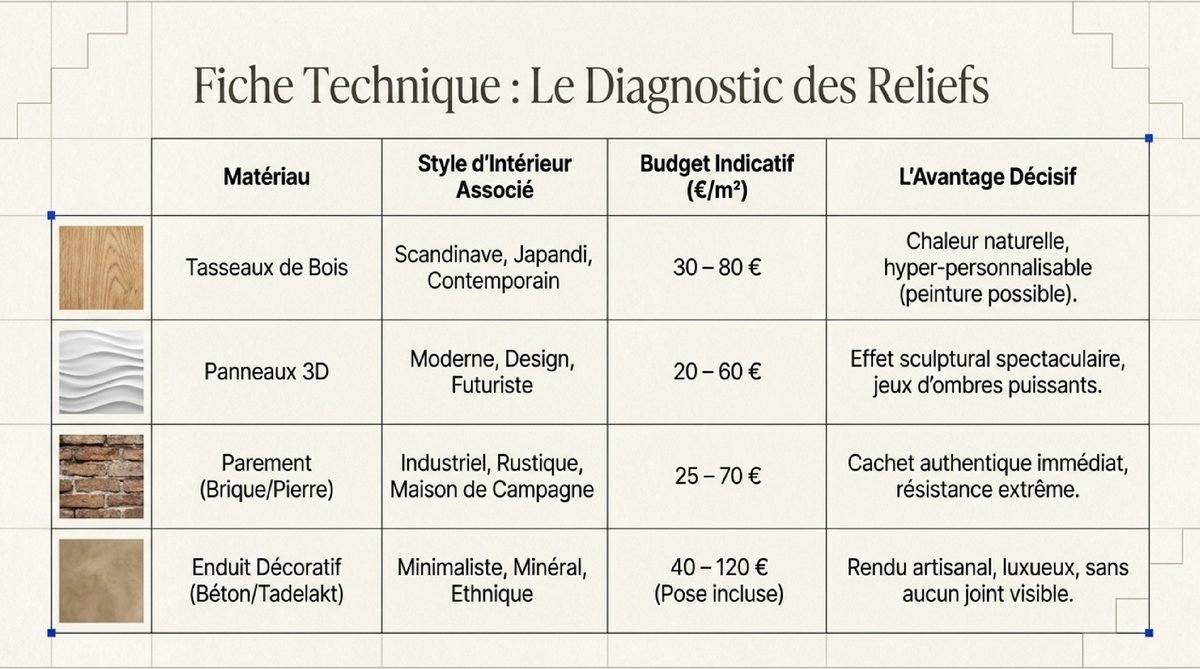| Matériau Texturé | Style d’Intérieur 🏠 | Coût indicatif (€/m²) 💰 | Points forts |