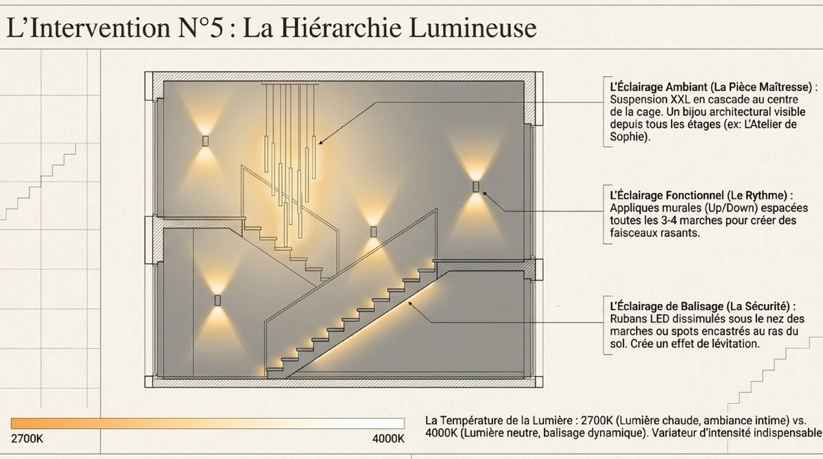 | Appliques murales | Ambiant / Fonctionnel | Élevé, crée du rythme et des jeux de lumière. | Installez-en plusieurs à intervalles réguliers (toutes les 3-4 marches). |