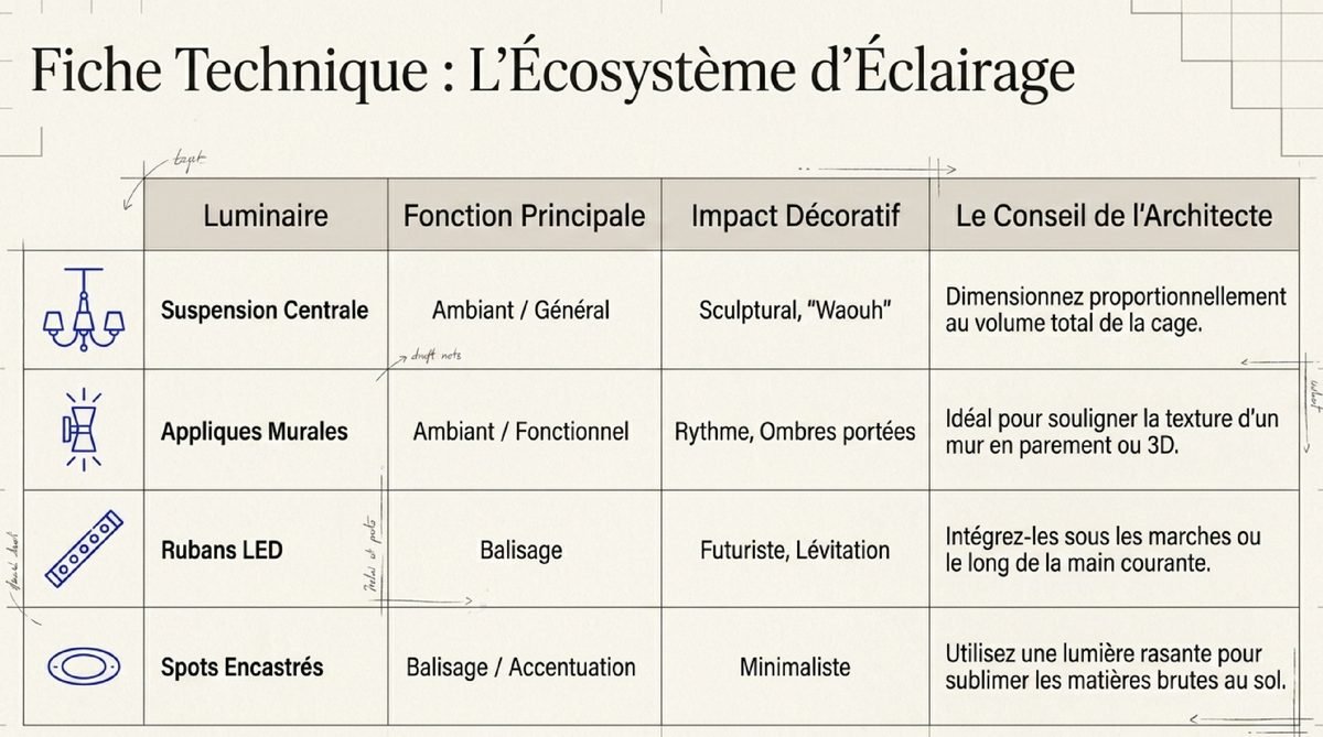 | Suspension centrale | Ambiant / Général | Très élevé, sculptural. | Choisissez une taille proportionnelle au volume de la cage d’escalier. |