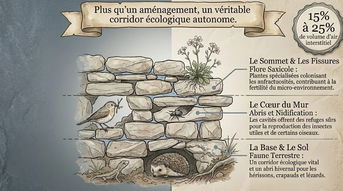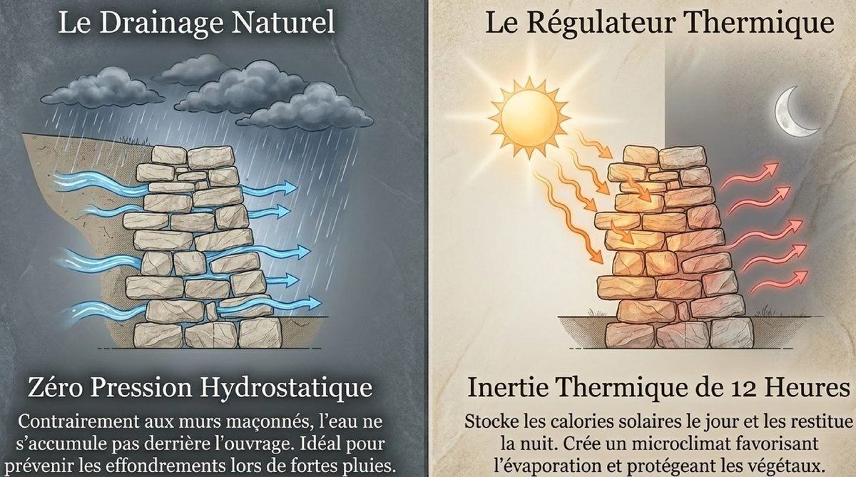 L’un des atouts que j’adore mentionner à mes amis jardiniers, c’est la capacité du mur en pierre sèche à drainer naturellement l’eau. Contrairement aux murs maçonnés traditionnels qui font barrage, les interstices entre les pierres permettent l’écoulement de l’eau, évitant ainsi l’accumulation d’humidité et les problèmes de poussée hydrostatique. Cette propriété est particulièrement précieuse dans les régions sujettes aux fortes pluies ou aux inondations, car le mur laissera passer l’eau au lieu de risquer de céder sous la pression.La pierre agit également comme un excellent régulateur thermique. Durant la journée, votre mur stocke les calories produites par le soleil et les restitue la nuit au sol et à l’air ambiant. Cette inertie thermique d’environ 12 heures tempère naturellement votre espace extérieur et contribue à l’évaporation de l’humidité, créant ainsi un microclimat favorable aux cultures et aux plantations. Si vous aménagez une terrasse méditerranéenne, cette propriété sera un atout majeur pour vos végétaux.Un Refuge Vivant pour la Biodiversité