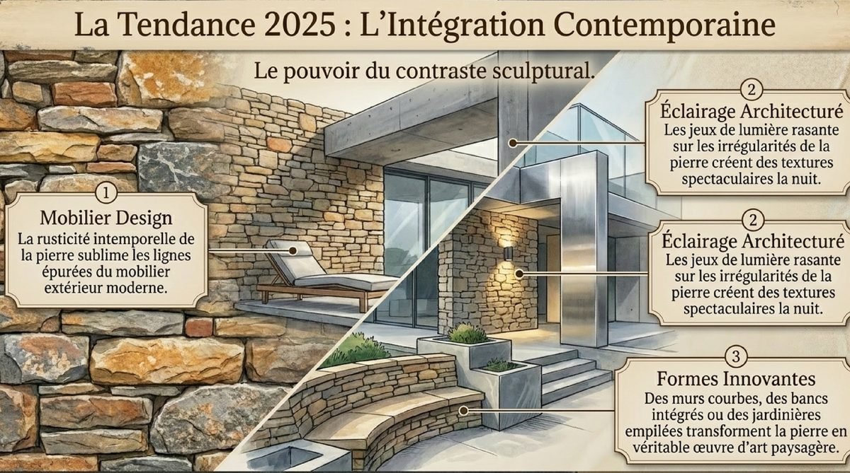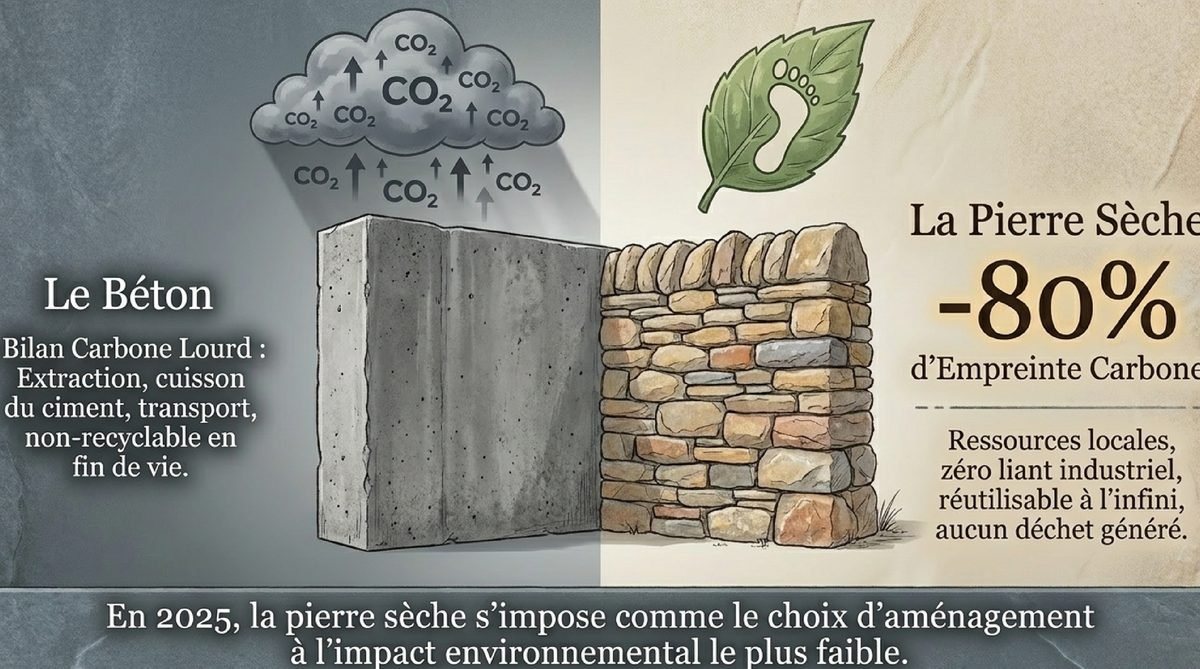 En 2025, la tendance s’oriente résolument vers des pratiques de construction durables et écologiques. Face à une demande croissante de matériaux respectueux de l’environnement, le mur en pierre sèche connaît un regain d’intérêt considérable que je trouve vraiment encourageant. Les particuliers et professionnels du paysage recherchent des solutions qui allient tradition et modernité.L’aspect éco-responsable du mur en pierre sèche répond parfaitement aux préoccupations environnementales contemporaines. Son faible impact carbone (jusqu’à 80% de réduction par rapport au béton traditionnel), sa capacité à créer des corridors de biodiversité et sa durabilité exceptionnelle en font un choix privilégié pour les jardins responsables. Découvrez d’autres tendances 2025 pour harmoniser votre aménagement.Intégration dans les Espaces Contemporains