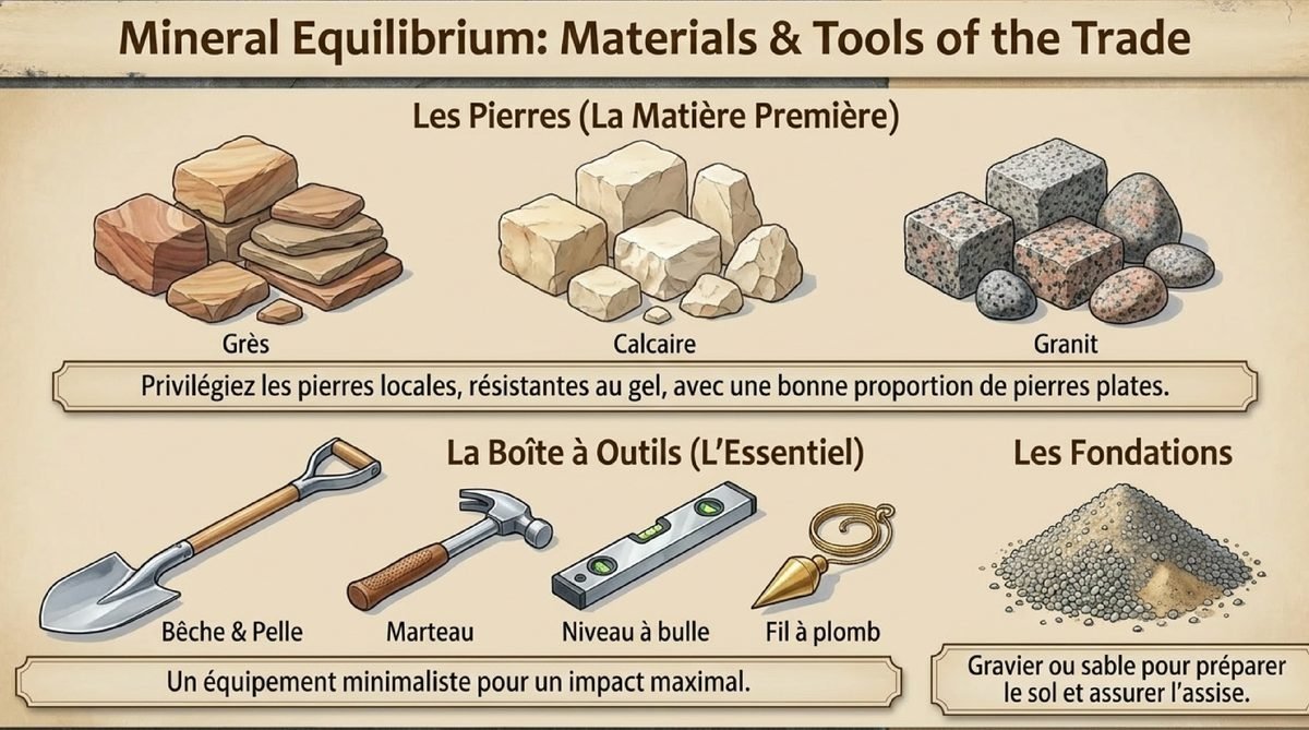 Pour ériger votre mur en pierre sèche, vous aurez besoin de pierres naturelles de différentes tailles et formes : grès, pierre calcaire ou granitique. Mon conseil ? Prévoyez une large gamme de dimensions, dont une bonne partie de pierres plates qui faciliteront grandement l’assemblage. Les pierres peuvent être récupérées d’anciennes constructions (un geste écologique que j’adore !), achetées en carrière locale, ou trouvées chez des fournisseurs de matériaux de construction.Côté outillage, équipez-vous simplement d’une bêche, d’une pelle, d’un marteau, d’un niveau à bulle, d’un fil à plomb, ainsi que de gravier ou de sable pour la préparation du sol. Ces outils essentiels vous permettront de réaliser un ouvrage stable et durable sans vous ruiner en équipement sophistiqué.Les Étapes de Construction Détaillées