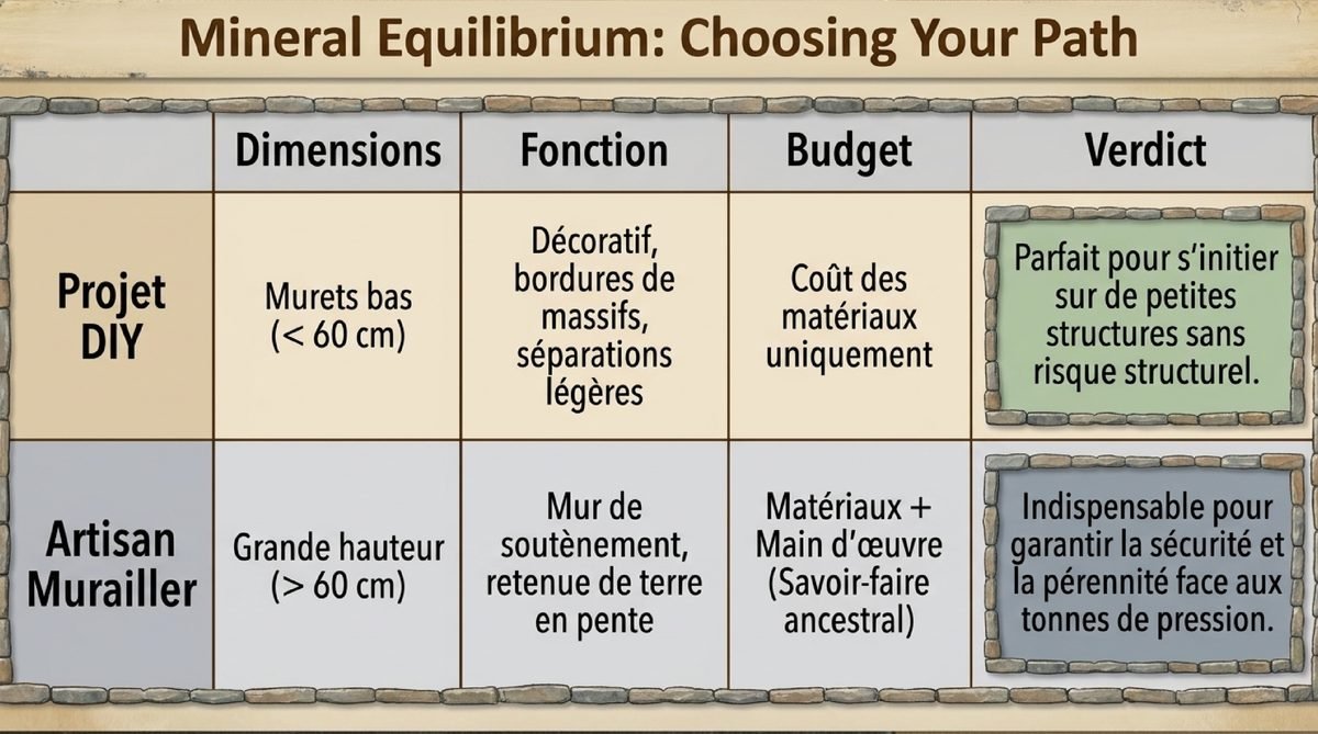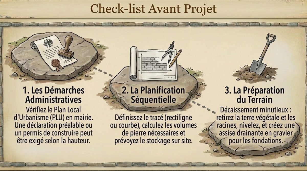 Si la construction d’un petit muret décoratif peut être envisagée en DIY (et je vous encourage à essayer pour les petits projets !), les ouvrages de soutènement ou de grande hauteur nécessitent absolument l’intervention d’un murailler professionnel. Ce savoir-faire spécialisé garantit la stabilité et la pérennité de votre construction.De plus en plus de paysagistes se forment à cette technique ancestrale pour proposer des services complets. N’hésitez pas à consulter plusieurs professionnels et à demander des références de leurs réalisations antérieures pour faire le bon choix. Pour d’autres projets d’aménagement, consultez mes conseils pour choisir les bons professionnels.Les Démarches Administratives