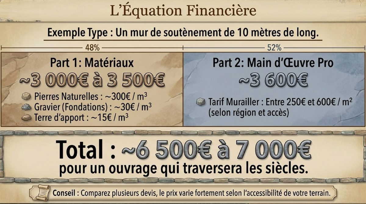 Parlons budget, car c’est une question que vous vous posez certainement ! Le coût des pierres varie selon le type choisi et la provenance. Comptez environ 300 euros par mètre cube pour des pierres naturelles de qualité. À cela s’ajoutent le gravier (environ 30 euros/m³) et la terre si nécessaire (15 euros/m³). Pour un mur de 10 mètres de long, prévoyez un budget matériaux d’environ 3 000 à 3 500 euros.Faire Appel à un Artisan Qualifié
