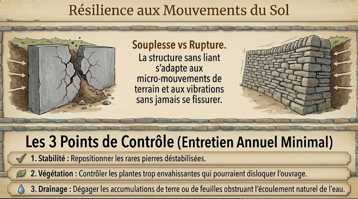 La flexibilité inhérente au mur en pierre sèche lui confère une excellente résistance aux mouvements du sol et aux vibrations. Contrairement aux structures rigides qui peuvent se fissurer, le mur en pierre sèche s’adapte aux contraintes mécaniques sans dommages majeurs. Cette résilience naturelle explique pourquoi de nombreux murs ancestraux traversent les siècles avec grâce !Tendances et Inspirations pour 2025