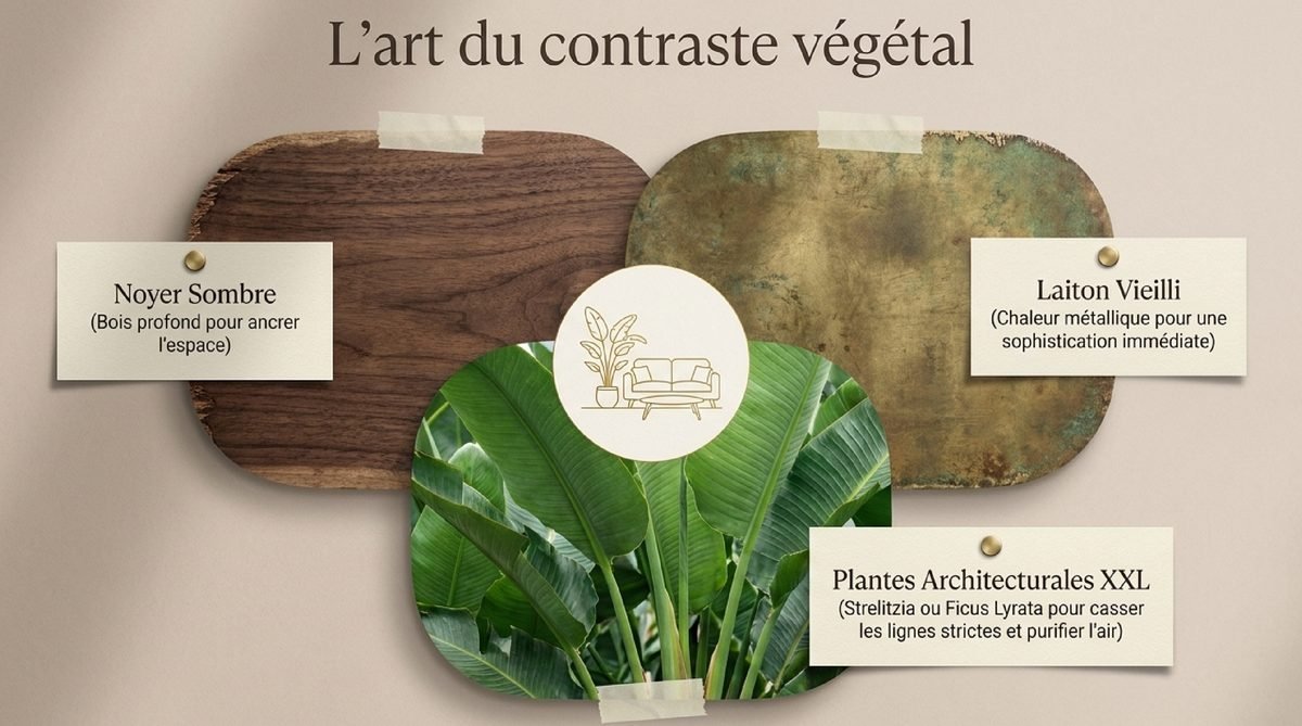 Adopter le vert botanique ne se limite pas à la peinture. C’est toute une philosophie d’aménagement qui se met en place. Les plantes d’intérieur XXL font leur grand retour, non plus comme de simples accessoires, mais comme de véritables éléments architecturaux. Un grand Strelitzia ou un Ficus Lyrata majestueux placé dans un coin stratégique du salon vient casser les lignes strictes de la pièce. Ces éléments vivants purifient l’air et apportent une dynamique visuelle sans pareille.
