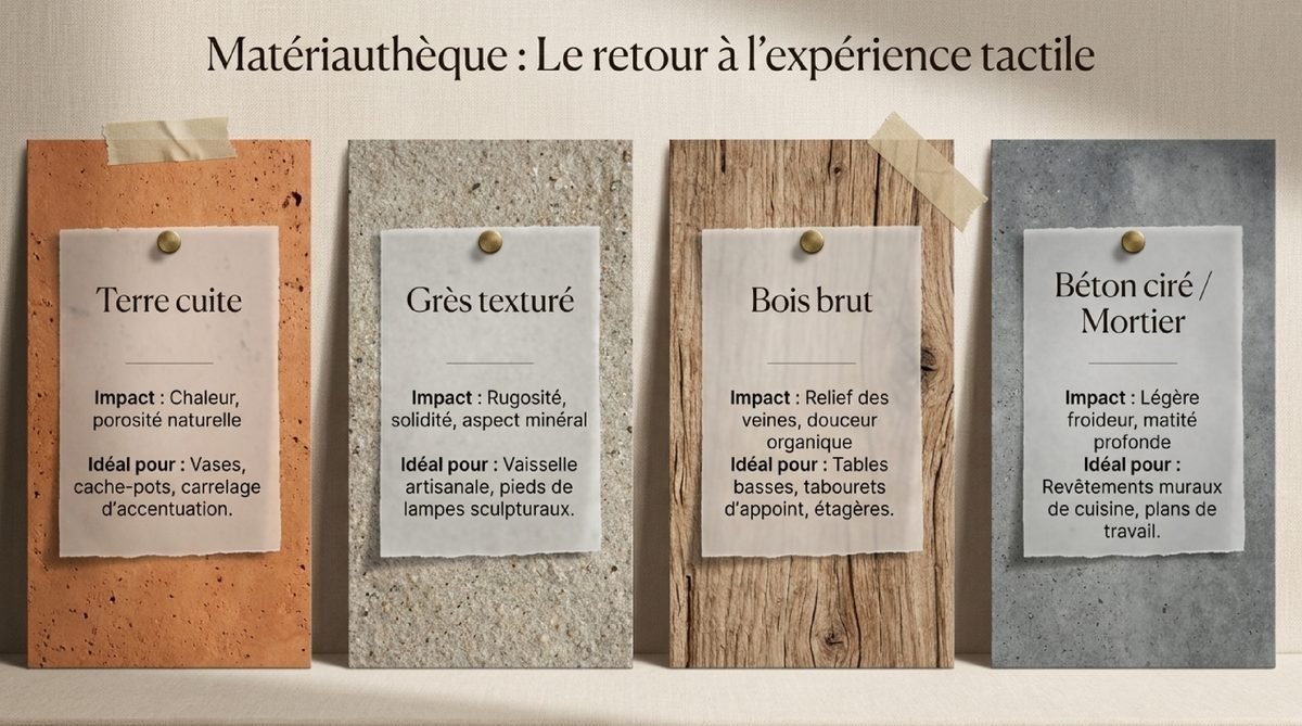 Au-delà de la couleur, l’âme d’une maison réside dans les matières qui la composent. Les surfaces lisses, plastifiées ou excessivement polies laissent définitivement la place à l’authenticité des matériaux bruts. La terre cuite, le grès, le mortier, le tadelakt et le bois non traité reviennent en force pour raconter une histoire unique. C’est le triomphe du wabi-sabi, cette philosophie japonaise qui célèbre la beauté des choses imparfaites, éphémères et modestes, brillamment réinterprétée dans le design d’intérieur contemporain pour apporter une chaleur inégalée.