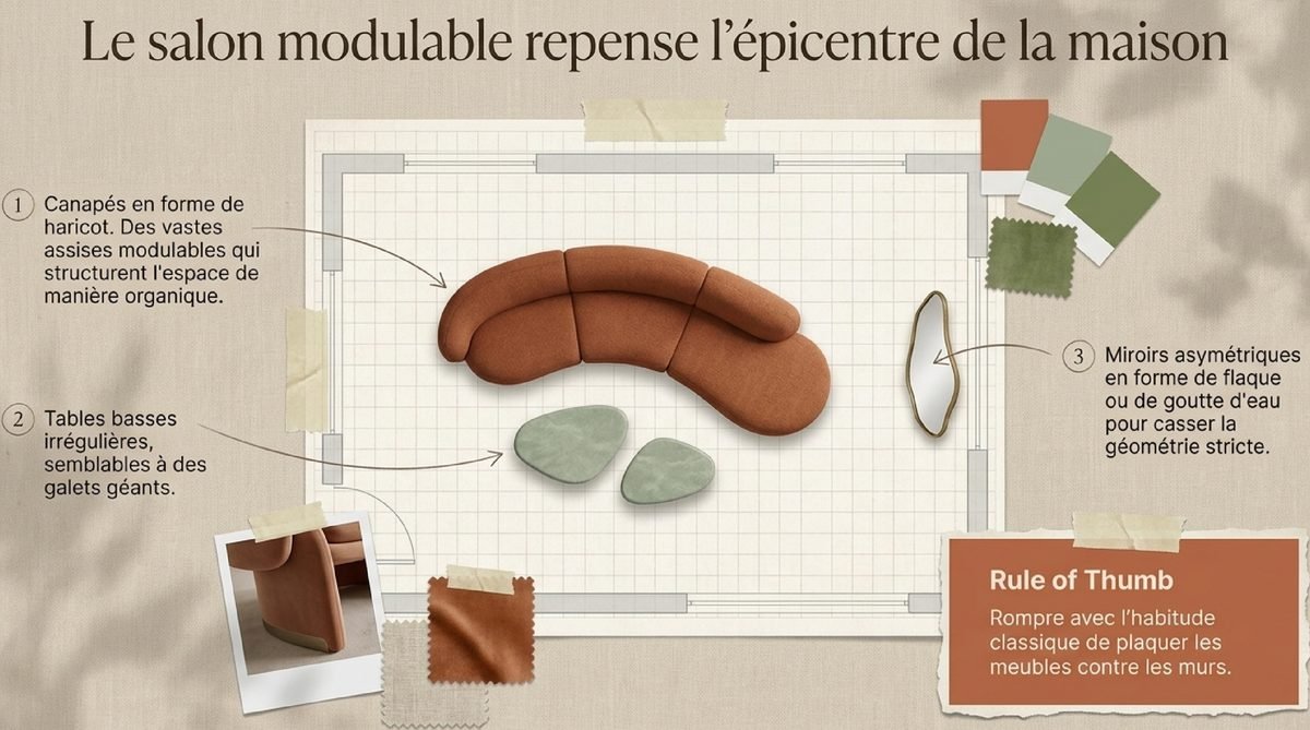 Le salon, épicentre de la maison, voit son élément central complètement repensé. Le fameux canapé d’angle strict est remplacé par de vastes assises modulables, composées d’éléments arrondis que l’on assemble selon ses envies et ses besoins. Recouverts de tissus texturés, ces nouveaux divans invitent à la convivialité et à la détente absolue. Ils se positionnent même au centre de la pièce pour structurer l’espace de manière organique, rompant avec l’habitude classique de plaquer les meubles contre les murs.