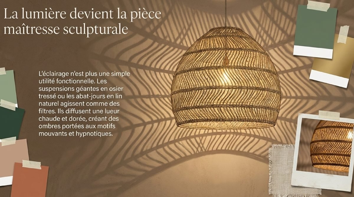 • 💡 La lumière sculpturale : Des luminaires en matières naturelles qui redéfinissent l’espace.