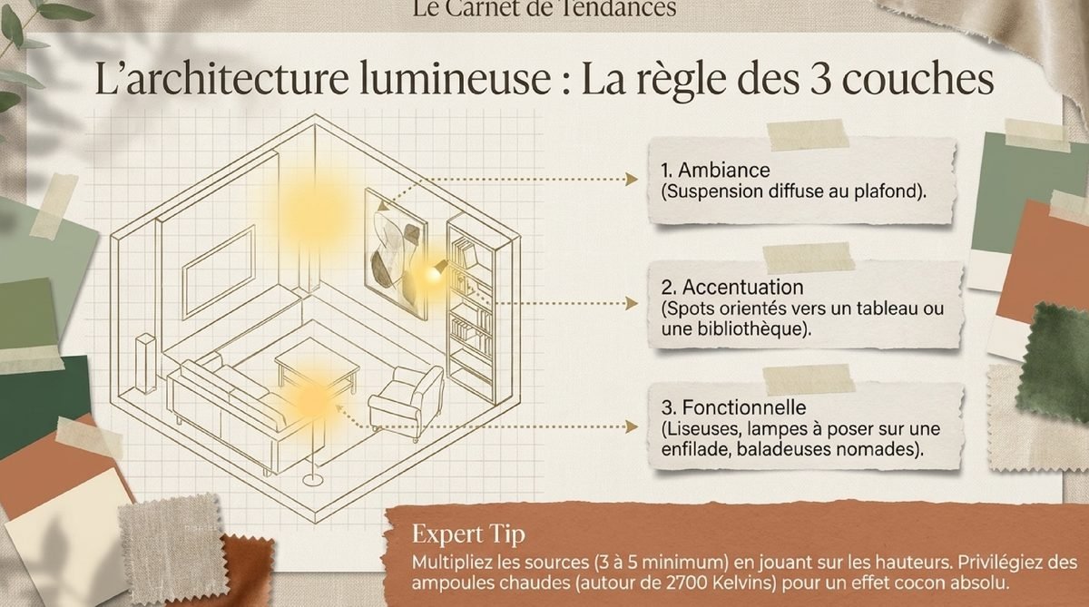 Le secret d’une atmosphère réussie réside dans la multiplication des points lumineux. Les professionnels recommandent au minimum trois à cinq sources de lumière différentes pour un salon de taille moyenne. On combine ainsi une lumière d’ambiance (suspension diffuse), un éclairage d’accentuation (spots orientés vers un tableau ou une bibliothèque), et des lumières fonctionnelles ou décoratives (liseuses, lampes à poser sur une enfilade, petites baladeuses nomades).