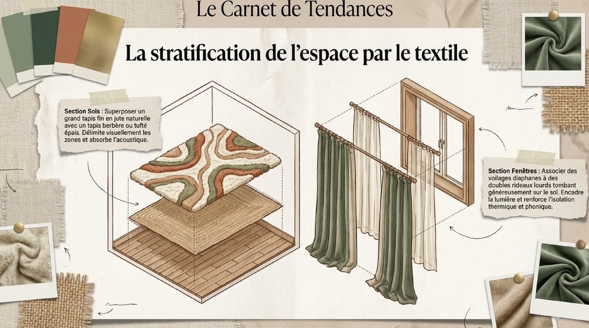Enfin, les fenêtres retrouvent de l’étoffe. Les voilages diaphanes se marient avec des doubles rideaux lourds et texturés, qui tombent généreusement sur le sol. Ce traitement textile des ouvertures encadre la lumière naturelle tout en renforçant l’isolation, tant thermique que phonique. Chaque détail compte pour transformer la maison en un sanctuaire protecteur. En maniant l’art des superpositions avec des teintes terreuses et végétales, vous garantissez à votre intérieur un cachet exceptionnel, profondément inscrit dans l’esprit de renouveau de ce printemps, où le bien-être n’est plus une option, mais le point de départ de toute création.