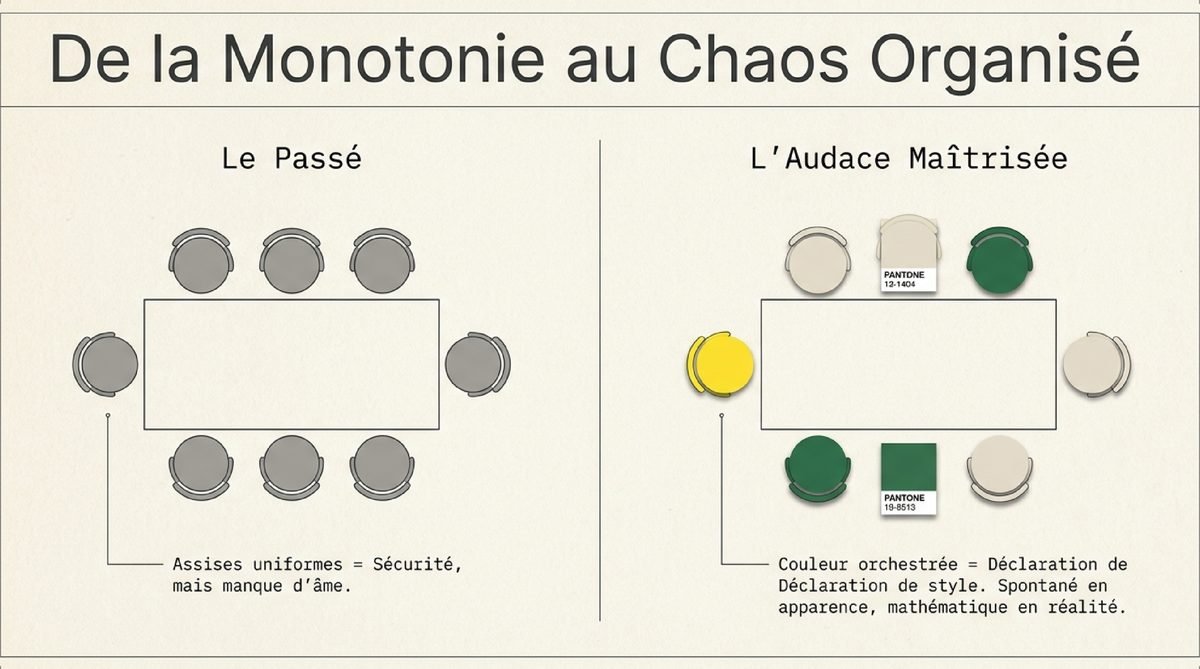 La célèbre règle du 60-30-10, bien connue en décoration murale, s’adapte parfaitement à la composition d’un ensemble de chaises. Elle offre un cadre simple pour équilibrer les couleurs et éviter la cacophonie. Le principe est de répartir les couleurs selon trois proportions : 60% pour une couleur dominante, 30% pour une couleur secondaire et 10% pour une couleur d’accent. Appliquée à une table de six chaises, cela pourrait se traduire par : quatre chaises (environ 60%) dans une teinte neutre ou de base (gris, blanc, noir, bois naturel), deux chaises (environ 30%) dans une couleur secondaire qui donne le ton, et une seule chaise (environ 10%) dans une couleur d’accent vive et surprenante. Cette structure crée un rythme visuel qui guide le regard et rend l’ensemble lisible et agréable. Par exemple, autour d’une table, on pourrait imaginer quatre chaises grises de chez Calligaris, deux chaises bleu canard et une dernière, flamboyante, de couleur corail. Cette dernière chaise, l’accent, devient un véritable bijou, un point d’exclamation qui dynamise l’ensemble sans le déséquilibrer. Pour en savoir plus sur les couleurs qui marqueront l’année, vous pouvez consulter les tendances couleurs 2025.