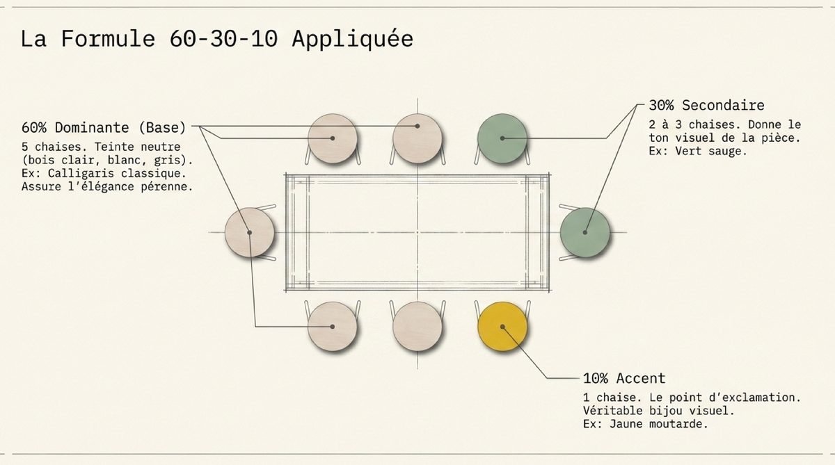 | 60% | Dominante (Base) | 5 | Chaises en bois clair ou blanches |