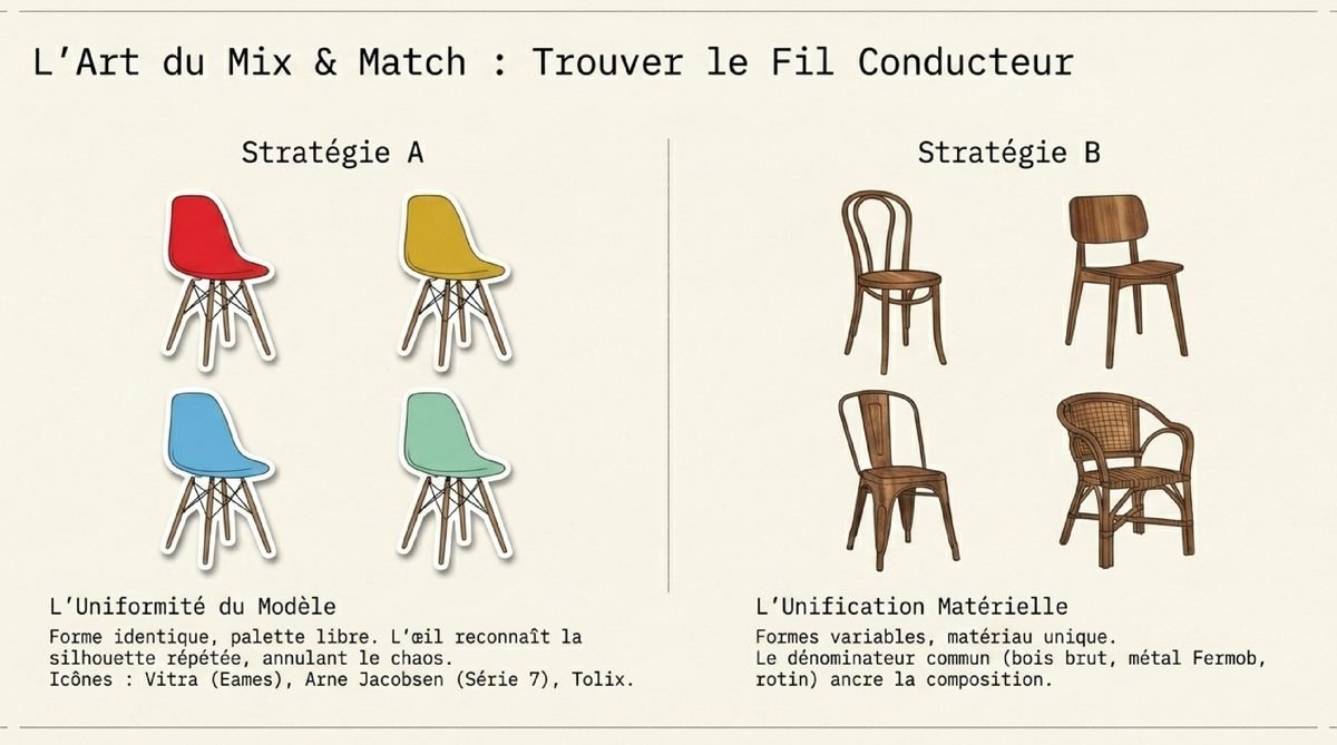 Si la couleur est le moyen le plus évident de jouer avec ses chaises, elle n’est pas le seul paramètre à considérer. Créer une harmonie avec des chaises dépareillées est un art subtil qui repose sur la recherche d’un fil conducteur. Cet élément unificateur est la clé pour que le mélange, même le plus audacieux, paraisse intentionnel et non accidentel. En se concentrant sur la forme, la matière ou le style, on peut se permettre une plus grande liberté chromatique. C’est une approche qui demande un peu plus d’observation et de réflexion, mais dont le résultat est souvent spectaculaire et profondément personnel. Un ensemble de chaises unies par un langage commun, qu’il soit matériel ou stylistique, raconte une histoire plus riche et plus complexe. Cela permet de mélanger des pièces de différentes époques, provenances et couleurs, tout en créant un dialogue cohérent et esthétique autour de la table. C’est la quintessence du « mix and match » réussi : un chaos organisé qui respire le charme et l’authenticité.