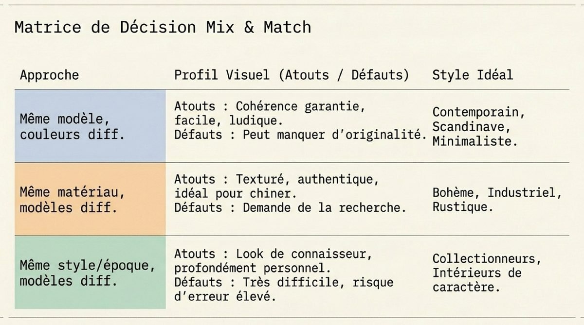 | Même style/époque, modèles différents | Look de connaisseur, très personnel et cultivé. | Le plus difficile à réaliser, demande une bonne connaissance du design. | Les amateurs de design, les collectionneurs, les intérieurs de caractère. |