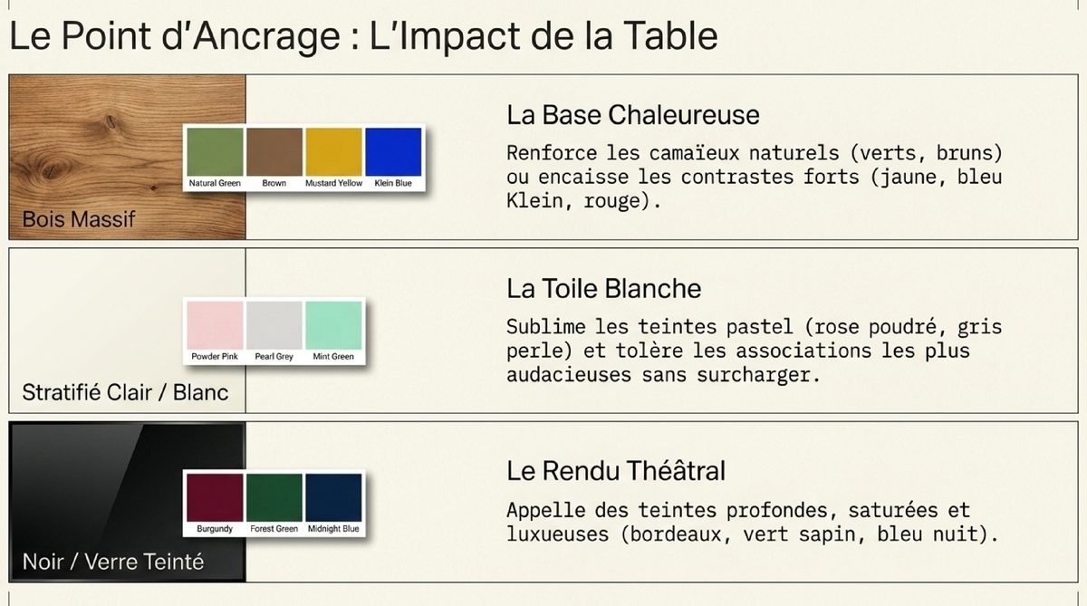 La table est le partenaire principal de vos chaises. Leur relation dicte une grande partie de l’ambiance. Une table en bois massif, par exemple, est une base chaleureuse et relativement neutre qui peut accueillir une grande variété de couleurs. Des chaises aux teintes vives (jaune, bleu Klein, rouge) créeront un contraste moderne et dynamique, tandis qu’un camaïeu de verts ou de bruns renforcera son côté naturel. Une table blanche ou en stratifié clair, comme on en trouve souvent dans les intérieurs scandinaves, est une véritable toile blanche. Elle sublime les couleurs pastel (rose poudré, vert d’eau, gris perle) et permet des associations audacieuses sans surcharger visuellement l’espace. À l’inverse, une table noire ou en verre teinté appelle des couleurs plus profondes et saturées, comme le bordeaux, le vert sapin ou le bleu nuit, pour un rendu sophistiqué et théâtral. Les tables avec un plateau en verre transparent sont les plus permissives : elles allègent l’ensemble et mettent en valeur la structure et la couleur des chaises, qui semblent flotter. Penser à cette interaction est la première étape pour créer une salle à manger moderne et équilibrée.