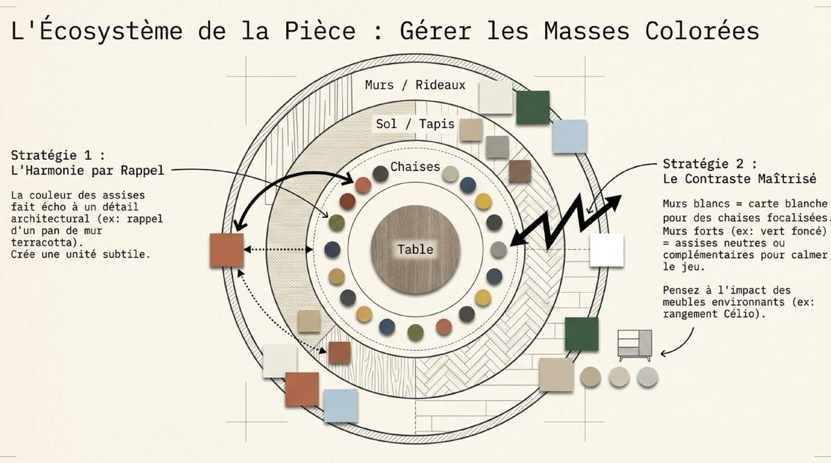 Les chaises doivent s’inscrire dans la palette de couleurs globale de la pièce. Observez les « masses colorées » dominantes : la couleur des murs, l’essence du parquet, la teinte du carrelage ou les motifs du tapis. Plusieurs stratégies sont possibles. La première est l’harmonie par rappel : choisir une ou plusieurs couleurs de chaises qui reprennent une teinte déjà présente dans la pièce, que ce soit celle d’un pan de mur, d’un coussin, d’un tableau ou des rideaux. Cette technique crée une connexion visuelle et un sentiment d’unité. Par exemple, dans un salon avec des touches de terracotta, une ou deux chaises de cette couleur feront un lien subtil et élégant. La seconde stratégie est celle du contraste maîtrisé. Si vos murs sont neutres (blancs, gris, beiges), vous avez carte blanche pour oser des chaises aux couleurs franches qui deviendront le point focal de la pièce. Si, au contraire, un mur est déjà peint dans une couleur forte, par exemple un vert profond comme dans une cuisine vert foncé ouverte sur la salle à manger, il peut être judicieux de choisir des chaises aux couleurs complémentaires (comme des tons rosés ou cuivrés) ou des teintes neutres pour calmer le jeu.