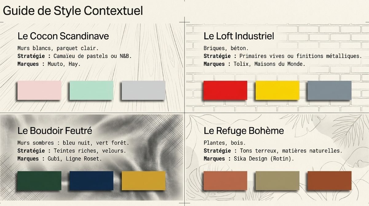 | Terrasse / Extérieur | Mélange libre de couleurs vives. | Estival, festif, décomplexé. | Fermob, marques spécialisées outdoor. |