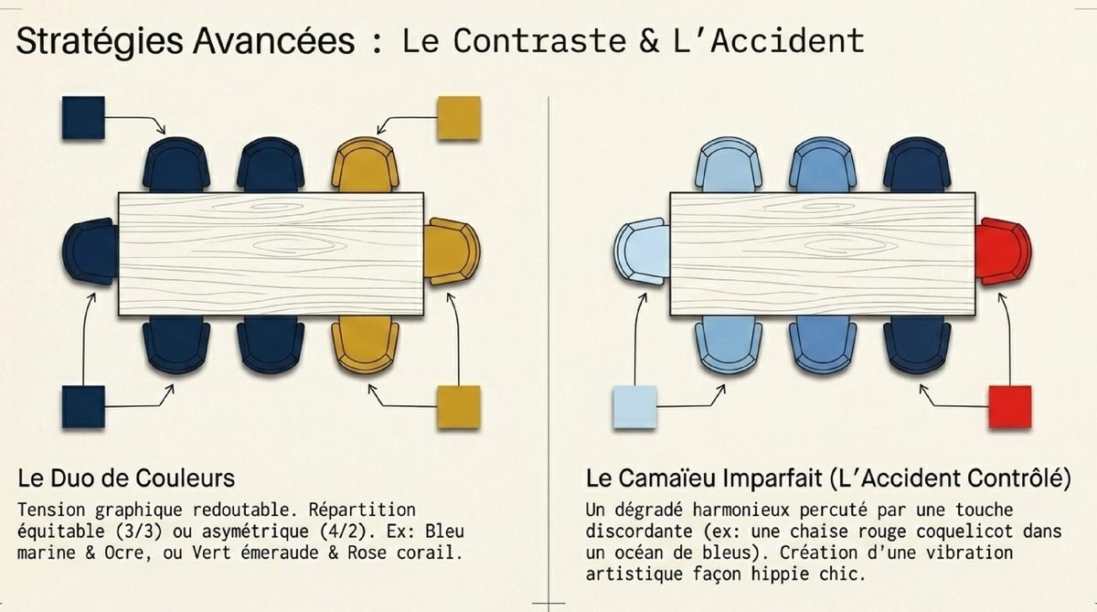 Enfin, pour ceux qui aiment les ambiances pleines de fantaisie, le camaïeu « imparfait » est une technique de connaisseur. Elle consiste à créer un dégradé harmonieux (par exemple, plusieurs chaises dans des tons de bleu) et d’y introduire une seule touche discordante, une couleur qui, en théorie, ne devrait pas être là. Imaginez une série de chaises allant du bleu ciel au bleu nuit, et soudain, une chaise rouge coquelicot. Cet accident contrôlé crée une vibration, une surprise qui rend la composition vivante et fascinante. C’est une astuce qui peut donner un côté décor hippie chic et artistique à la pièce, montrant que l’on ne prend pas la décoration trop au sérieux, tout en la maîtrisant parfaitement.