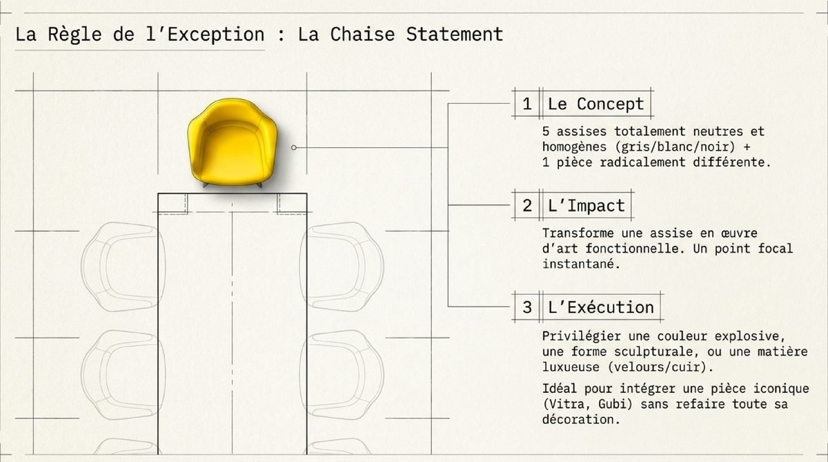 Cette stratégie est l’une des plus théâtrales et des plus simples à mettre en œuvre. Elle consiste à créer un ensemble de chaises très sobre et homogène (par exemple, cinq chaises identiques de couleur neutre comme le gris, le blanc ou le noir) et à y introduire une seule et unique chaise radicalement différente. Cette chaise « statement » devient instantanément le point focal de la pièce, une véritable œuvre d’art fonctionnelle. Elle peut se distinguer par plusieurs aspects : une couleur explosive (un jaune citron au milieu de chaises grises), une forme sculpturale (un fauteuil design au lieu d’une chaise classique), ou une matière luxueuse (une chaise en velours ou en cuir au milieu de chaises en bois). C’est l’occasion de s’offrir une pièce iconique d’un grand designer, comme un modèle de chez Vitra ou Gubi, qui agira comme un bijou. Cette approche est parfaite pour ceux qui veulent une touche d’originalité sans chambouler toute leur décoration. C’est une affirmation de style discrète mais puissante, qui montre une maîtrise de la composition et un goût pour l’exceptionnel. Le reste de la salle à manger doit rester relativement sobre pour laisser toute la place à cette star.