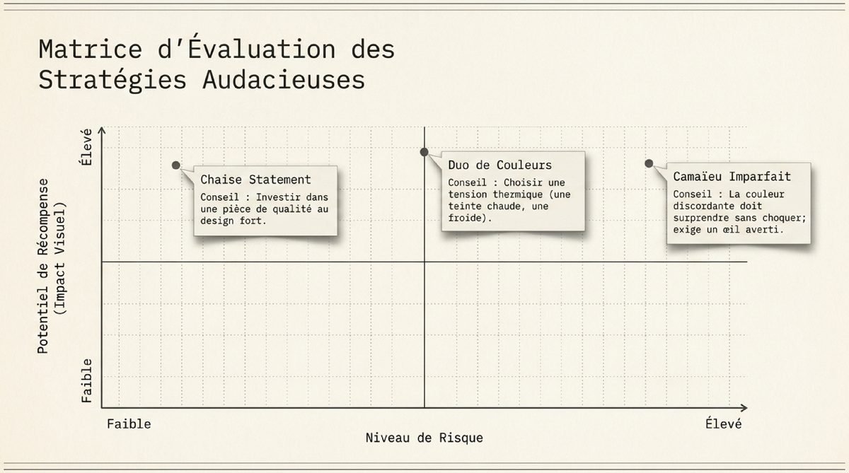 Une fois les règles de base maîtrisées, il est temps de s’amuser et de les transgresser avec intelligence pour créer un intérieur véritablement unique. Les combinaisons audacieuses ne sont pas le fruit du hasard, mais d’une intention forte : celle de surprendre, d’émouvoir et d’affirmer une personnalité. Il ne s’agit plus seulement d’harmoniser, mais de créer une tension créative, un dialogue inattendu entre les couleurs et les formes. C’est dans cette prise de risque maîtrisée que naissent les décors les plus mémorables. Que ce soit par un duo de couleurs percutant, l’introduction d’une pièce d’exception ou un jeu subtil de dissonance, ces stratégies avancées permettent de sculpter l’espace et de lui donner une âme. Elles s’adressent à ceux qui voient leur salle à manger non pas comme un simple lieu fonctionnel, mais comme une toile d’expression, un reflet de leur propre audace et de leur sensibilité esthétique. Oser, c’est donner à son intérieur une voix qui porte.